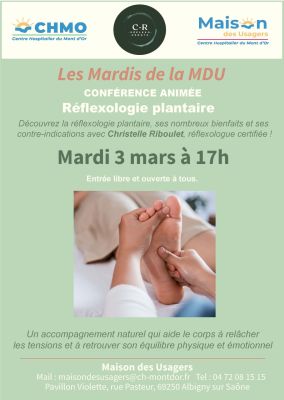 La Maison des Usagers a le plaisir de vous inviter à une conférence animée consacrée à la réflexologie plantaire, une approche naturelle favorisant le bien-être et l’équilibre du corps ce mardi 3 mars 2026 de 17 h à 18 h 30 à la Maison des usagers du Centre Hospitalier du Mont d’Or, rue pasteur à Albigny sur Saône.