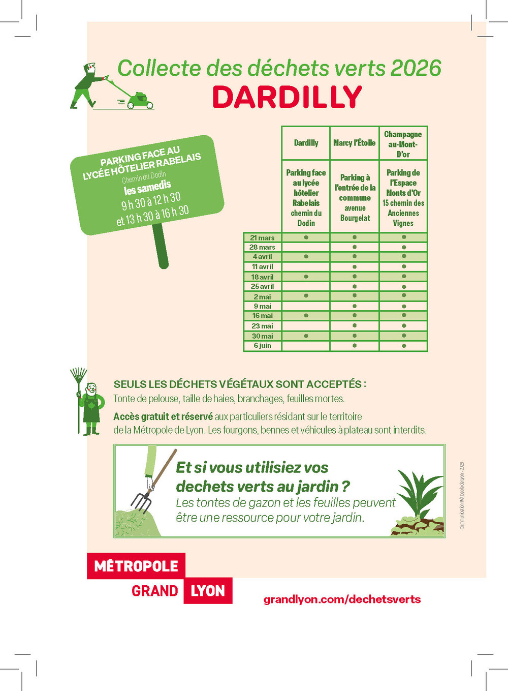Taille de haies, tontes, feuilles, élagage… À l’approche du printemps, les espaces verts nécessitent bien souvent de l’entretien ! Pour atténuer la fréquentation dans certaines déchèteries de l’agglomération et offrir un service de proximité aux habitants, la Métropole de Lyon met en place des points de collecte pour vos déchets verts.